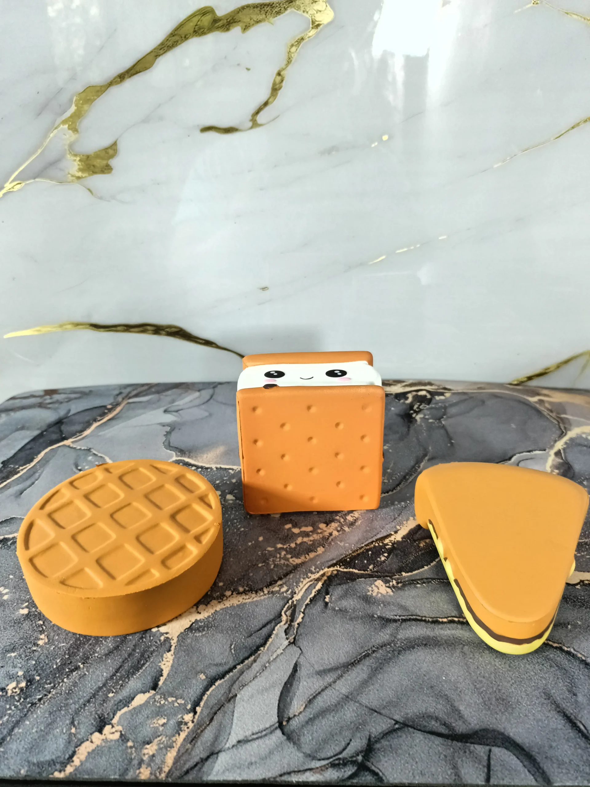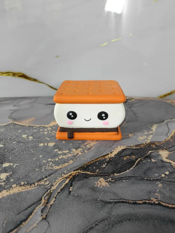 La Galleta S’mores Cuadrada: Inspirada en el clásico s’more, este squishy combina dos galletas cuadradas con un “malvavisco” suave y una capa de “chocolate derretido”. Su diseño compacto y sus texturas contrastantes lo hacen delicioso de apretar y perfecto para quienes aman los postres irresistibles.