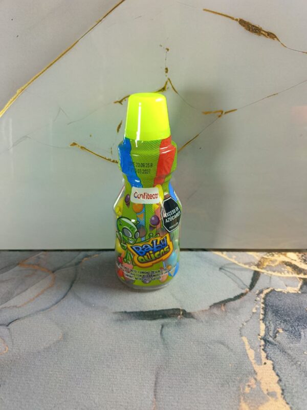 El envase del tetero baby aliens es práctico y fácil de manipular, permitiendo consumir las grageas de manera cómoda. Además, su forma ayuda a conservar el producto y a disfrutarlo poco a poco, sin complicaciones.