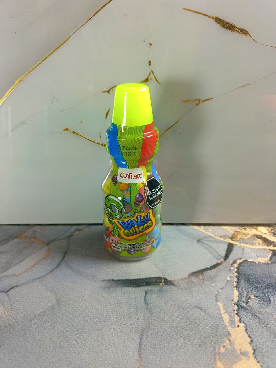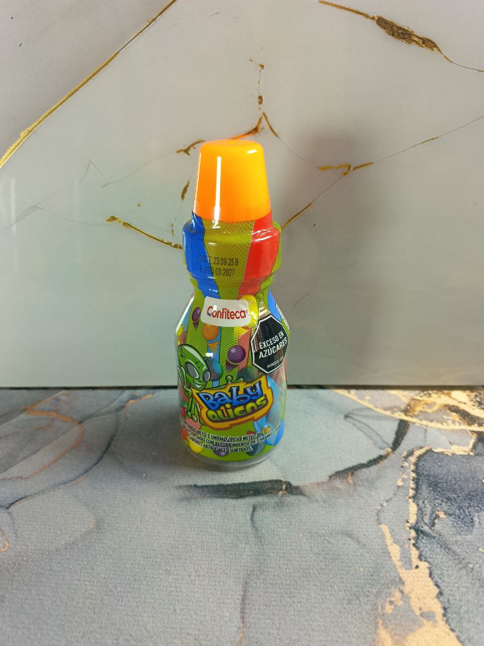 El tetero baby aliens es un dulce pensado para sorprender desde el primer momento gracias a su presentación creativa y su combinación de texturas. Este producto viene en un envase tipo tetero, decorado con un diseño colorido y llamativo, que contiene grageas elaboradas a base de cereal soplado con recubrimiento de caramelo duro y sabores surtidos. Su formato lo convierte en una opción distinta frente a los dulces tradicionales, ideal para quienes disfrutan de presentaciones originales y sabores dulces intensos.
